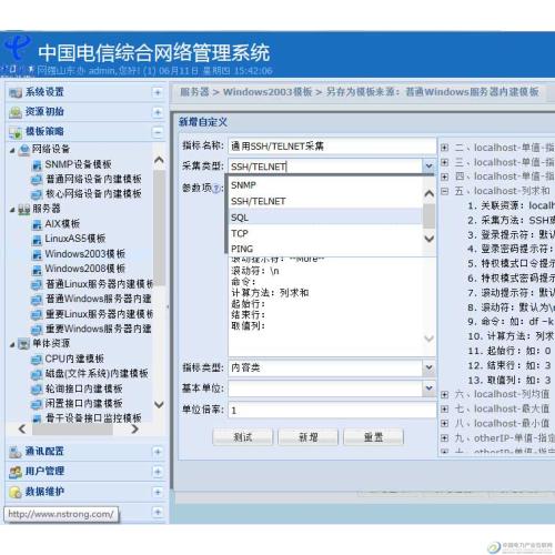 ITmaster可以通过模板策略进行新增自定义SNMP、TELNET、SSH、TCP、SQL等指标,同时也可以对此新的指标设置阈值、异常类型、异常过滤等,满足运维人员对IT设备指标的灵活监控需求,省去了传统网管系统高昂的二次开发费用的同时,真正帮助中国电信应对各种网络的变更、调整与扩展等,以不变应万变维护好企业的整体网络。可以通过这个方法增加很多监测项。还满足了中国电信非编程的需求,当中国电信的IT资源再扩展时,无需进行编程等二次开发,即可将扩展的资源通过自定义通用指标添加到网管系统中进行集中监控。通过这些方法大大扩充了系统的使用能力,降低了后续因二次开发带来的高昂成本。